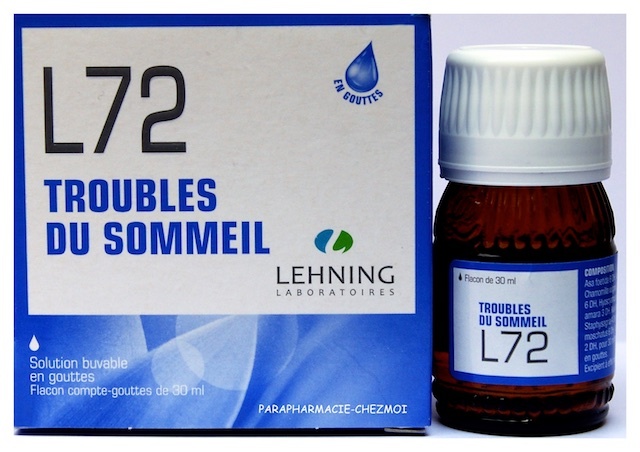 Lehning L72 Troubles Mineurs du Sommeil 30 ml Lehning L72 est un médicament homéopathique qui est utilisé pour les troubles mineurs du sommeil, ainsi que pour les troubles liés à l'anxiété et l'hyperexcitabilité Prévenezmoi lorsque le produit ou un équivalent est disponible Avena sativaContient de l'alcool A partir de 30 mois Chez l'enfant, un trouble du sommeil nécessite de consulter votre médecin Ce médicament contient au maximum 43 % V/V d'éthanol gouttes contiennent 158 mg d'éthanol En raison de la présence d'éthanol, ce médicament est dangereux pour les personnes souffrant d'alcoolismeNe prenez jamais L72, solution buvable en gouttes